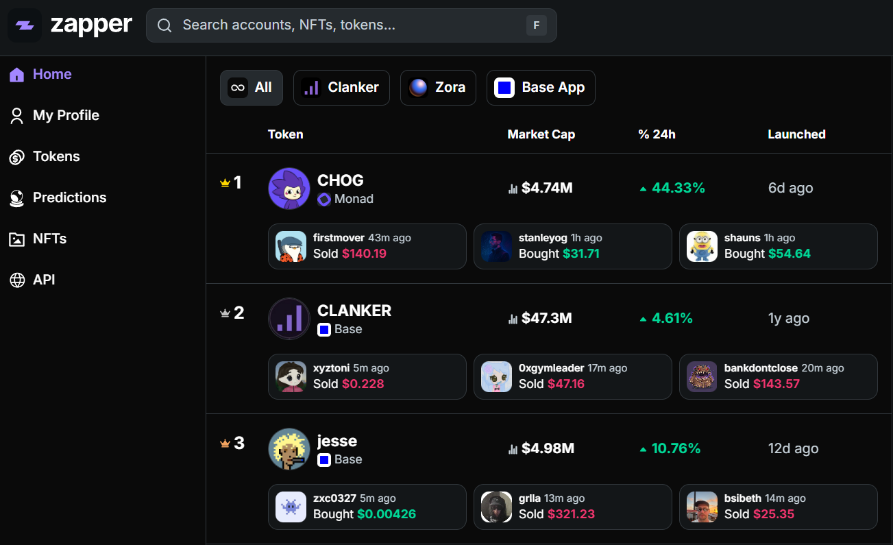 Zapper is a search platform and exploration tool for web3. The discovery pages show you connected pathways to help you explore popular Tokens, NFT collections & DeFi apps.