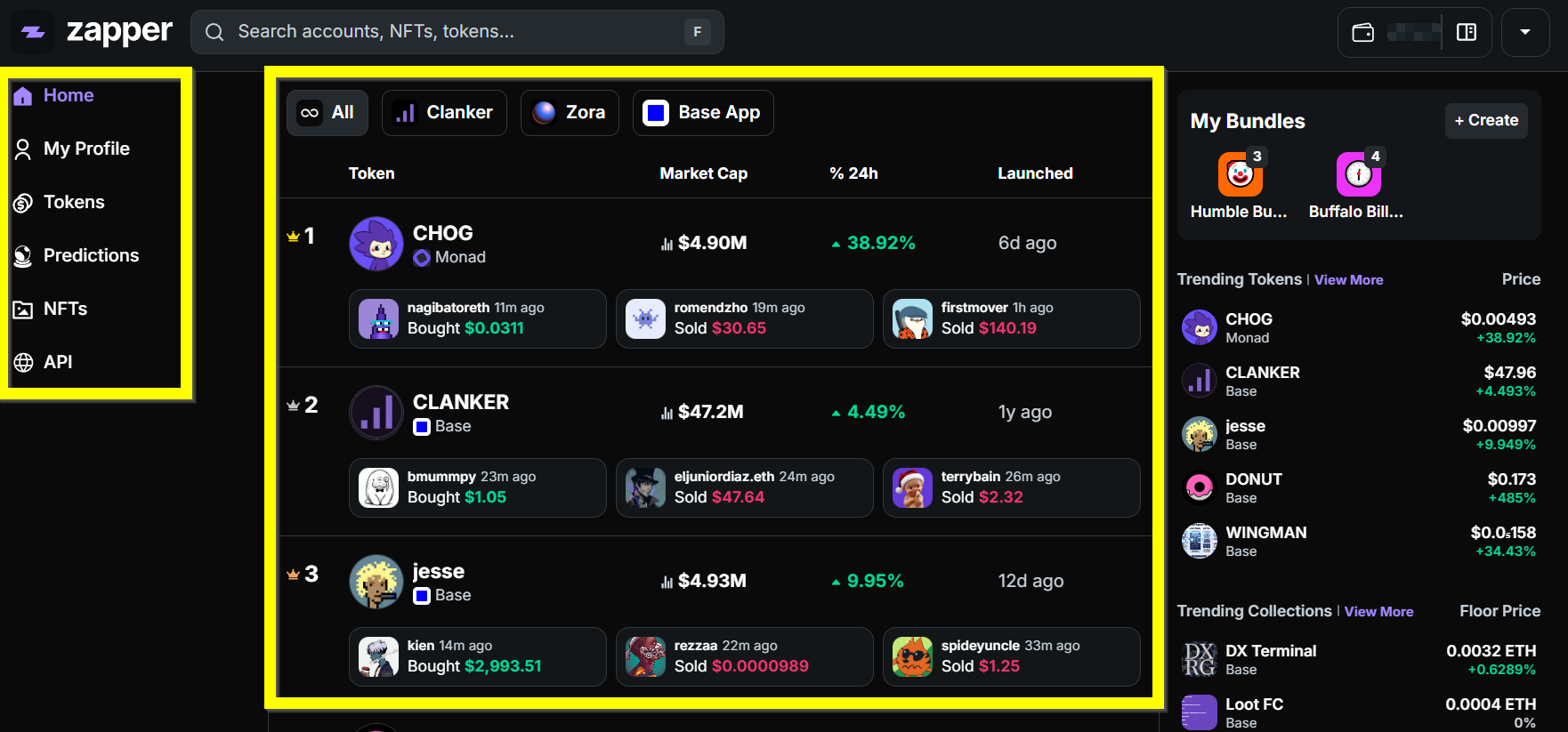 Additionally, at the top of the homepage, there is a search bar that you can use to look up any account, token, NFT collection, Farcaster Profile, or wallet address you are curious to explore.