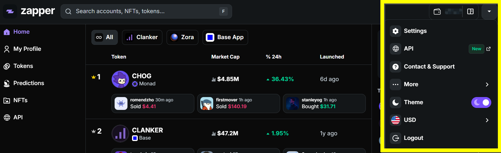 There are a few settings on Zapper that you can adjust to personalize your dashboard experience. These customization options include selecting a light or dark theme, and setting a preferred language, currency, and visible networks.