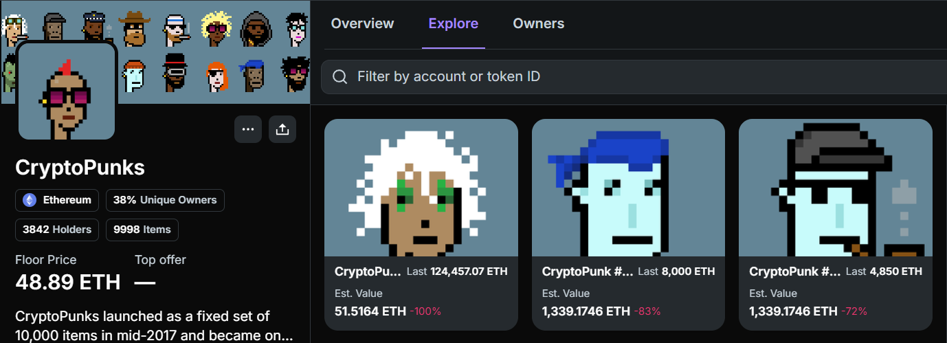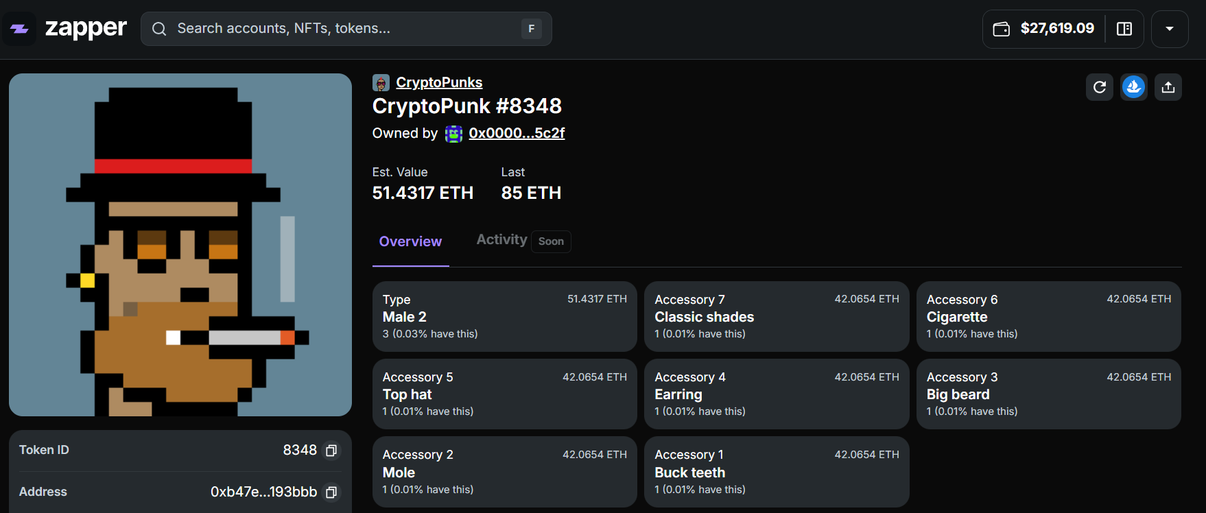For example, the Cryptopunk with the highest rarity on Zapper, Cryptopunk #8348, displays an estimated value superior to the floor price. Our algorithm factors in the value of the rare “Top Hat” trait, and the fact that the last sale price of a Cryptopunk with this trait was above the floor price.
