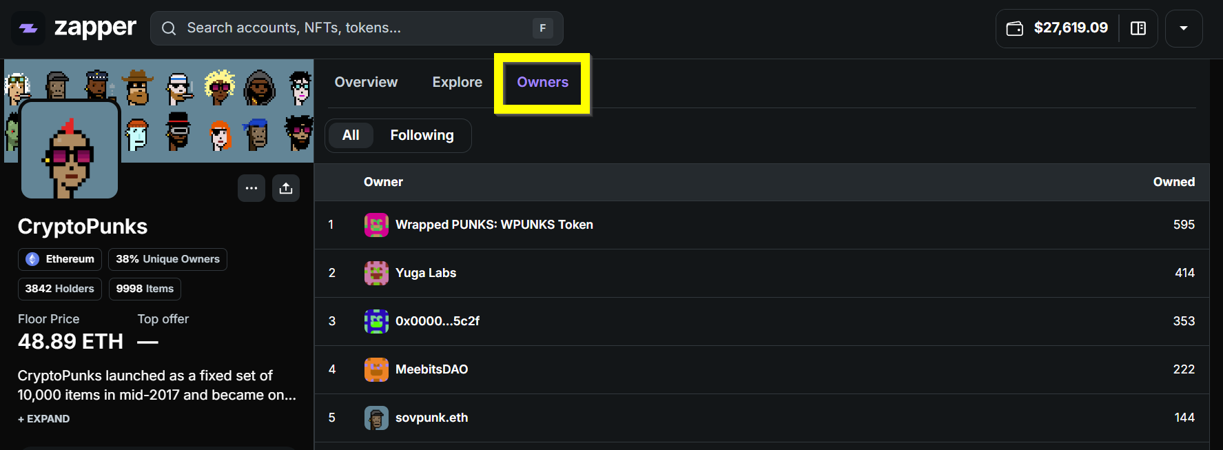 Above the list of individual NFTs, there is a toggle that allows you to switch this default “Explore” view to the “Owners” view. The “Owners” tab lets you discover all of the NFT holders of a single collection, and this list can be further sorted to include only wallets you follow.